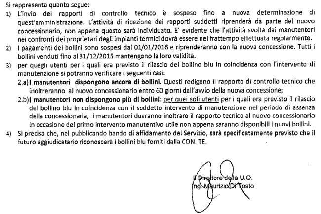“Lunedì 4 gennaio 2016”, informa una nota della Cna di Roma, “i manutentori che operano nel territorio di Roma Capitale sono stati informati via mail dall'ATI CON.TE. che la stessa cessava di essere concessionaria del servizio pubblico di controllo dello stato di esercizio e manutenzione degli impianti termici e che, pertanto, gli uffici dedicati allo Sportello al pubblico, nonché alla vendita dei bollini, sarebbero restati chiusi.