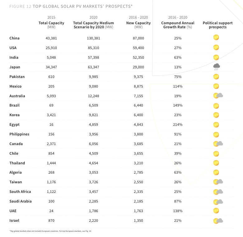 L’Asia, che ha già scalzato l’Europa nella leadership del solare, regnerà incontrastata anche nei prossimi anni. Il più arriva dalla Cina, che già nel primo trimestre del 2016 ha aggiunto oltre 7 GW alla potenza installata e ha raggiunto una capacità complessiva di 43 GW. Nel 2015, secondo il report, i tre mercati principali sono stati Cina, Giappone, e Stati Uniti, con i primi due paesi responsabili di oltre il 50% della nuova capacità fotovoltaica installata.
