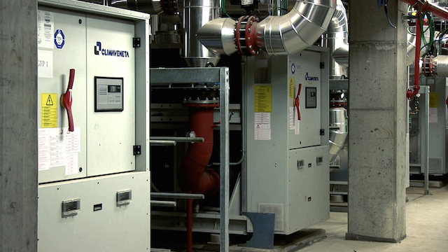 Durante la mezza stagione, infine, un sistema di gestione computerizzato dell’impianto consente alle unità di funzionare in parte come pompe di calore e in parte come gruppi frigoriferi. Tutto ciò è possibile grazie alla presenza nel sistema di tutte pompe a portata variabile gestite da inverter, che consentono una distribuzione all’interno dell’impianto della sola acqua– calda o fredda –realmente necessaria, evitando quindi qualsiasi spreco.