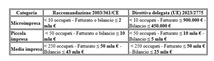 Se inizialmente i criteri per l’individuazione della categoria di appartenenza erano quelli previsti dalla direttiva delegata 2023/2775, durante l’iter di conversione questi sono stati modificati con quelli previsti dalla raccomandazione 2003/361/CE.