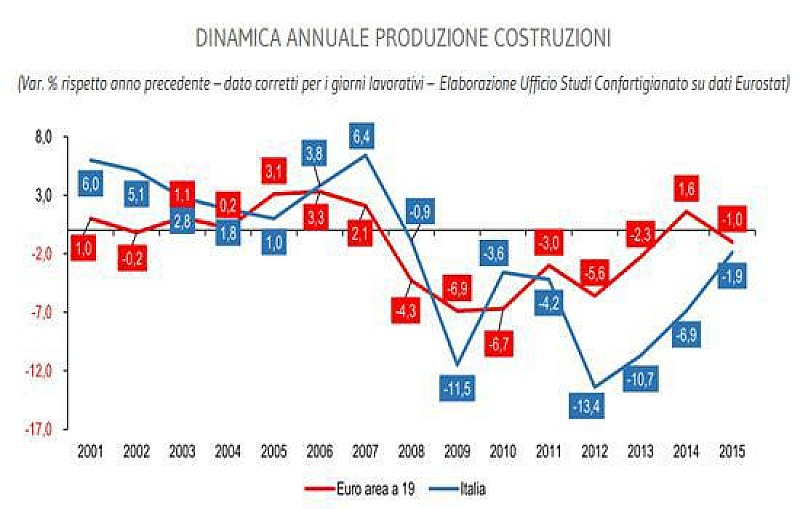 L'andamento su base annua della produzione nelle costruzioni in Italia registra un calo dell’1,9% nel 2015, ma in sensibile decelerazione rispetto ai forti cali degli anni precedenti: -6,9% nel 2014, -10,7% nel 2013 e -13,4% del 2012.