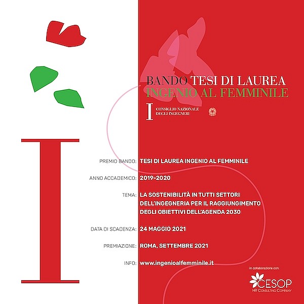 Nel corso della terza giornata di lavori del 65° Congresso degli Ingegneri Italiani, è stato presentato il “Bando tesi di laurea Ingenio al femminile”, volto a premiare le migliori tesi di laurea delle donne ingegnere neolaureate inerenti il tema “La sostenibilità in tutti i settori dell’ingegneria per il raggiungimento degli obiettivi dell’Agenda 2030”.